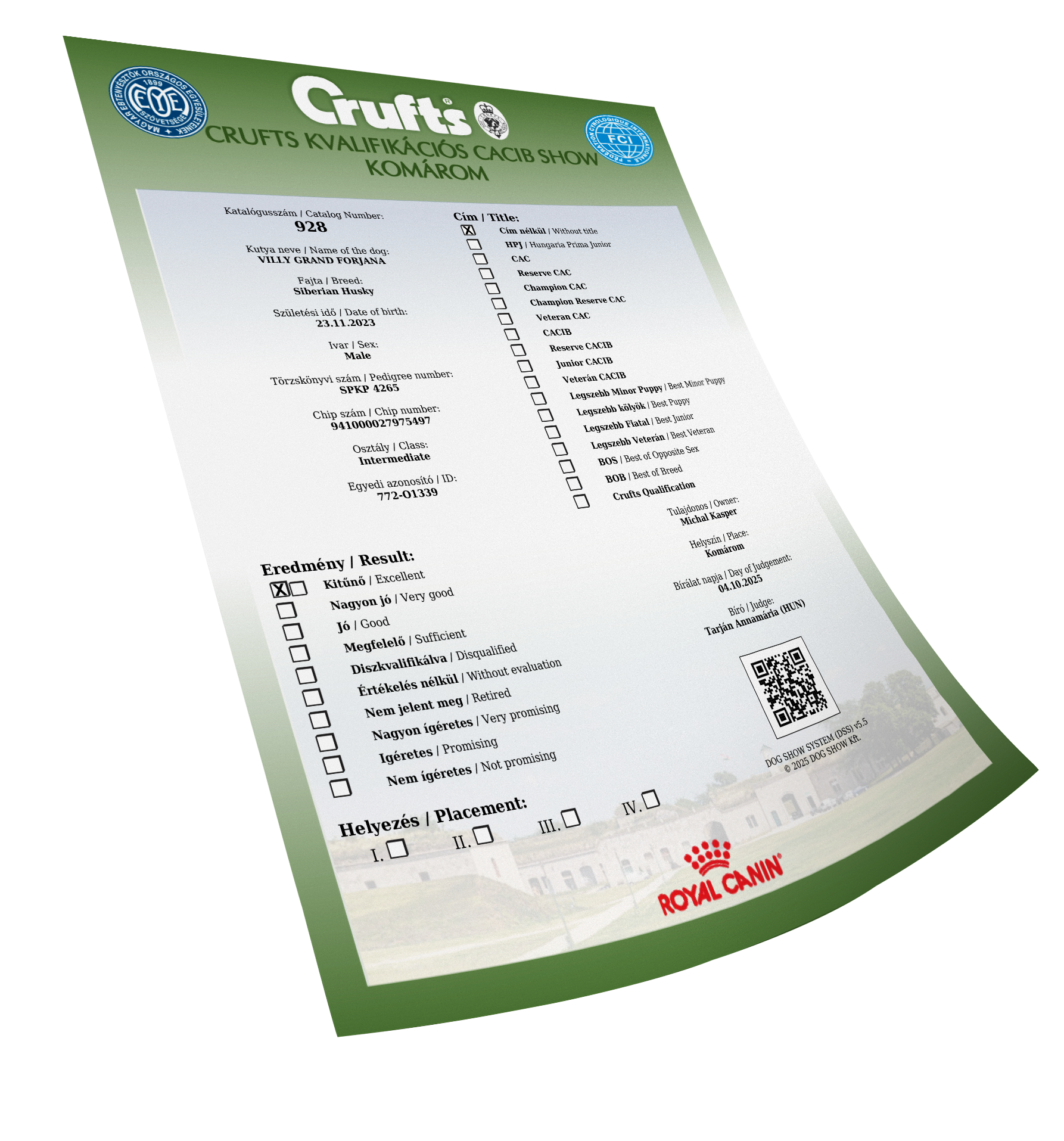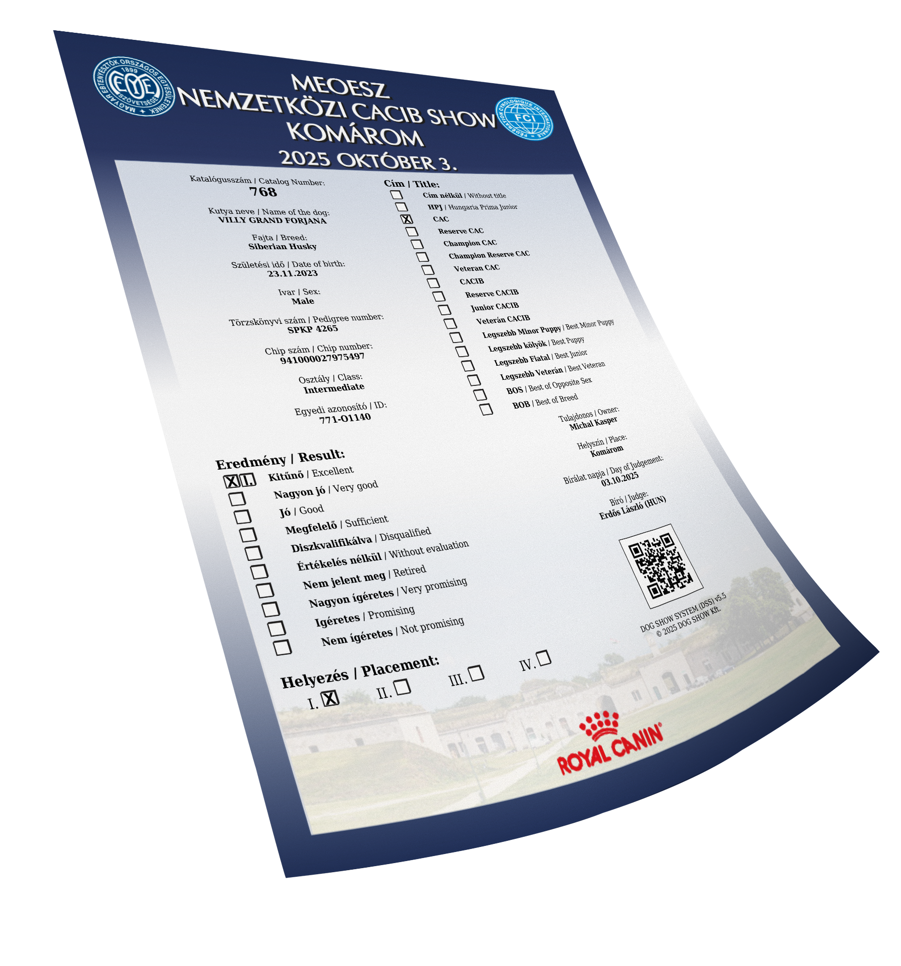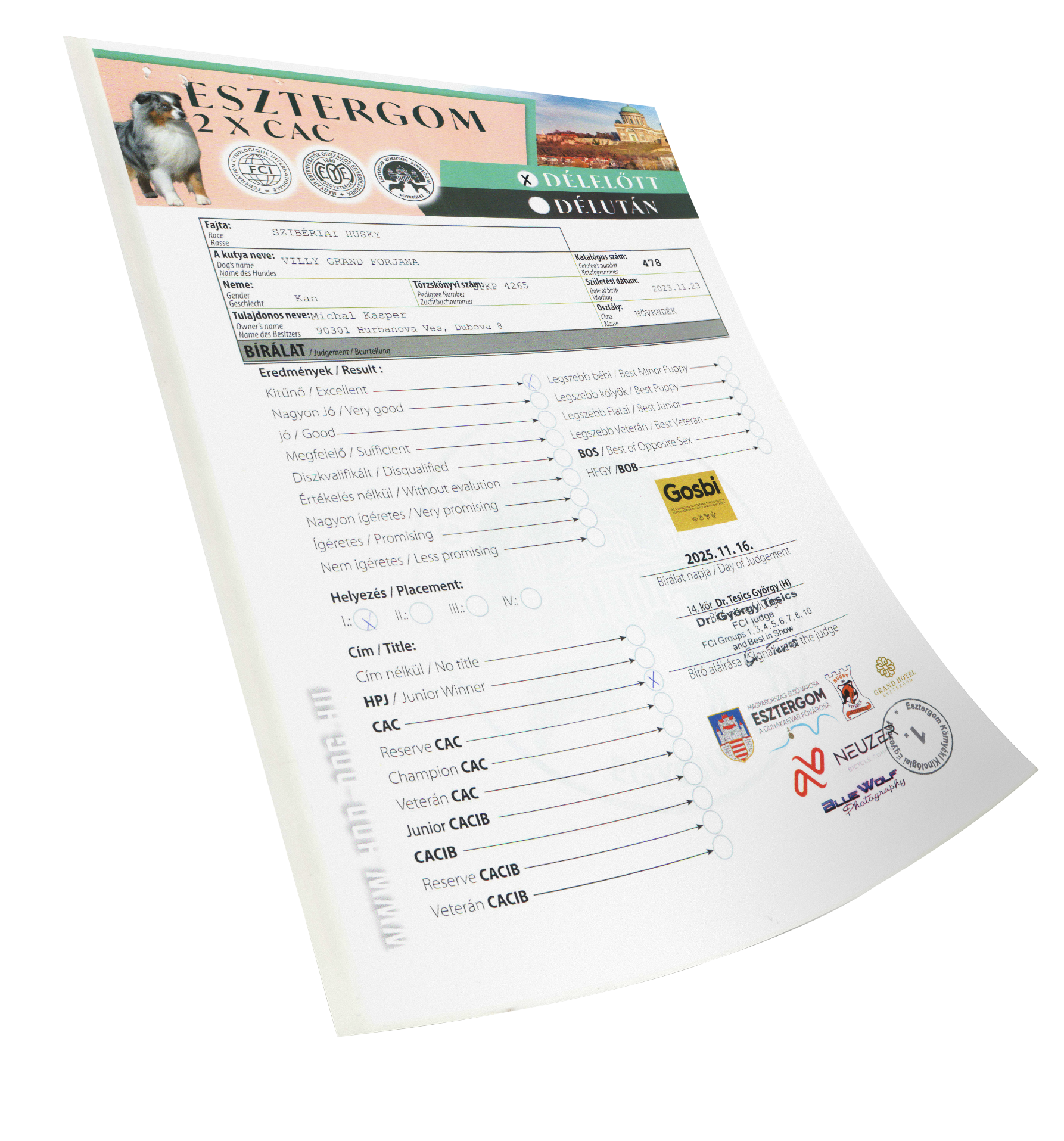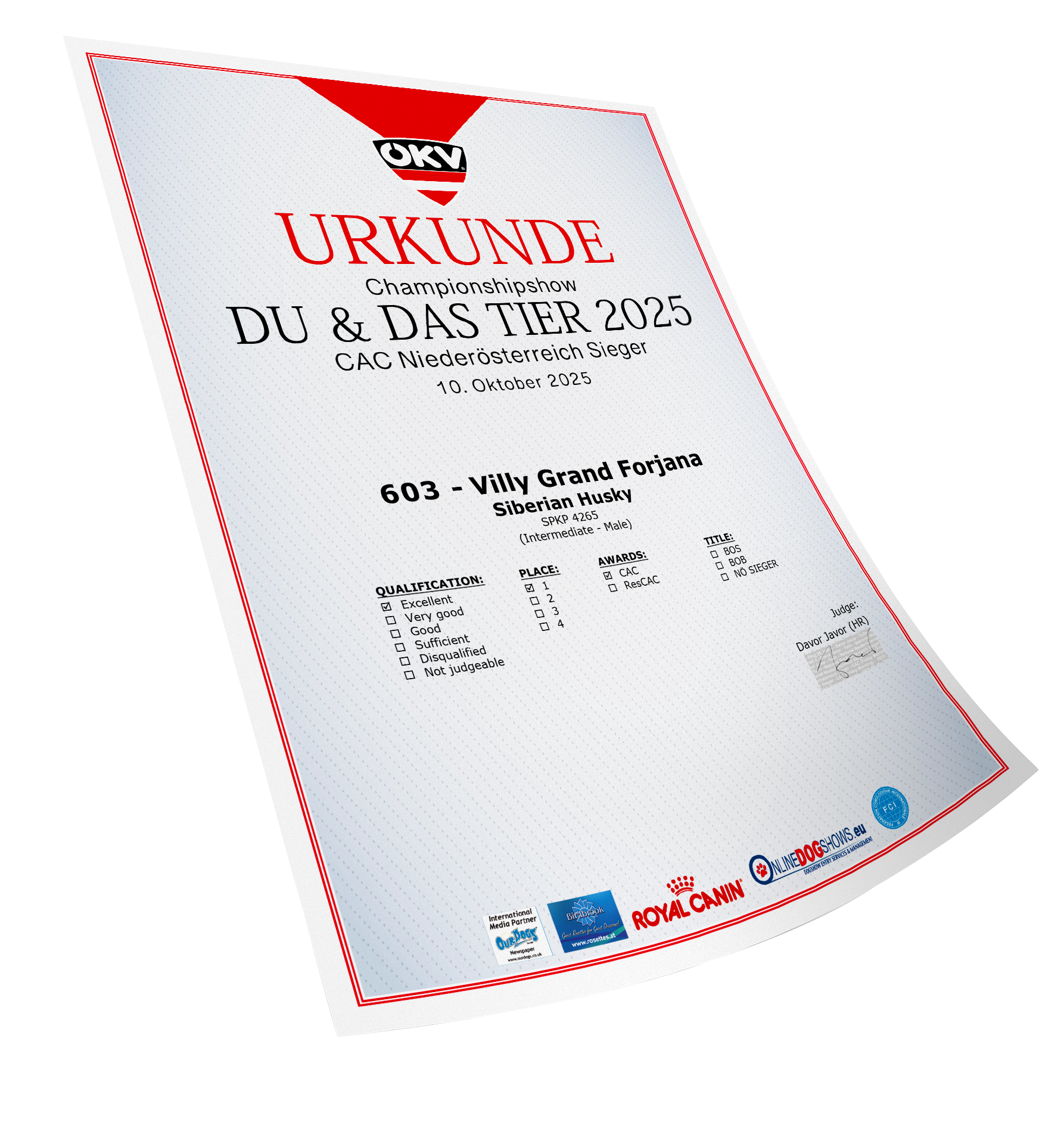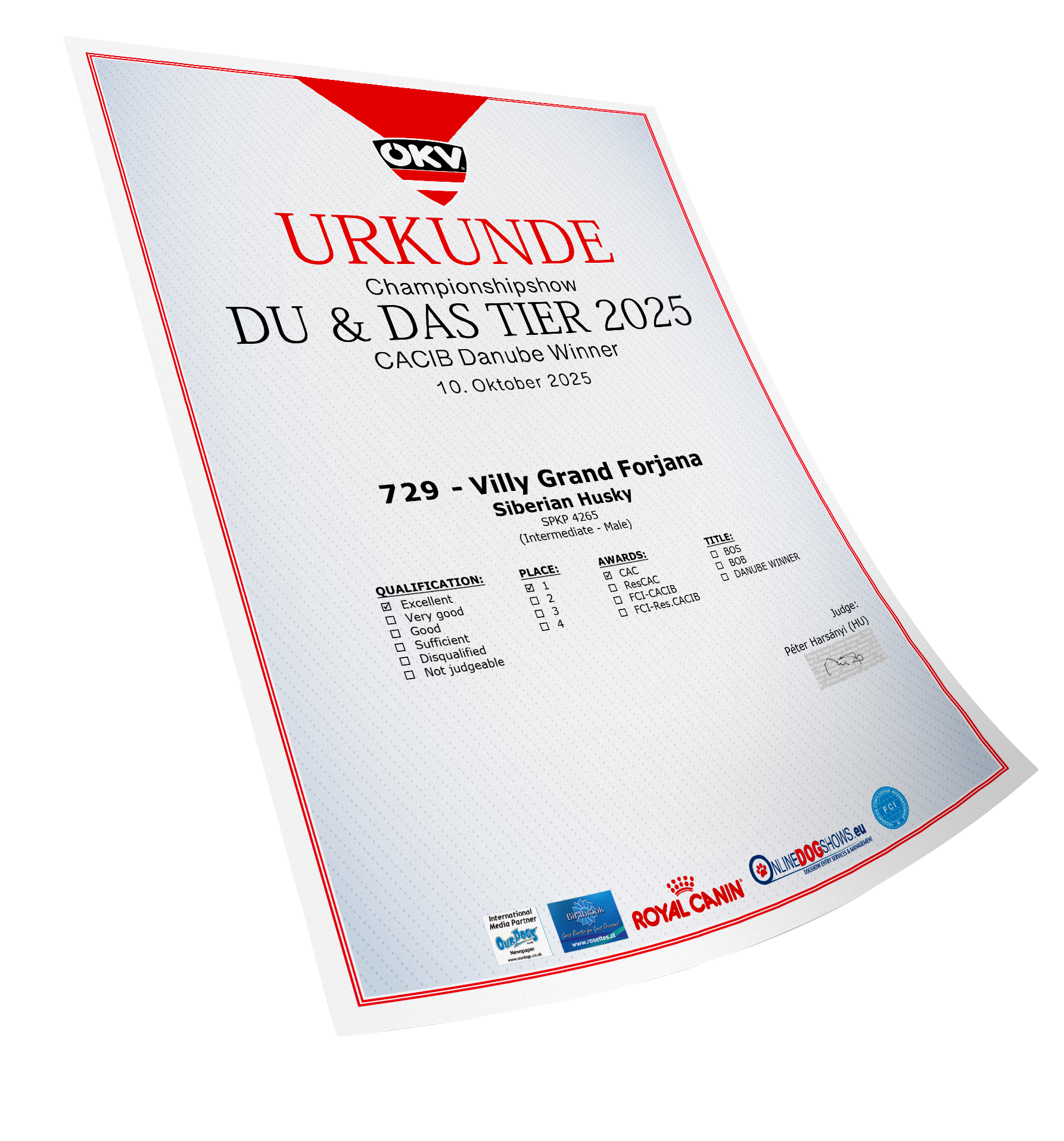 Ocenenia Esztergom 2 x CAC 16.11.2025 Komarom CACIB 3-4.10.2025 International Championship show DU & DAS TIER TULLN 10-12.10.2025 Arad 4-6.7.2025 Winter Danube 1-2.3.2025 Danube CACIB 25-27.10.2024 NitraDog CACIB 19.12.2024 Šampionáty