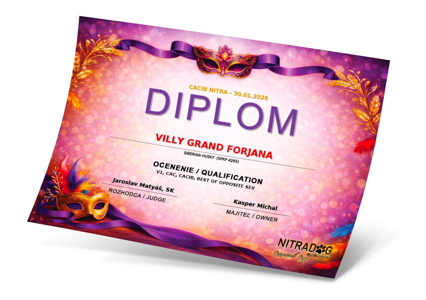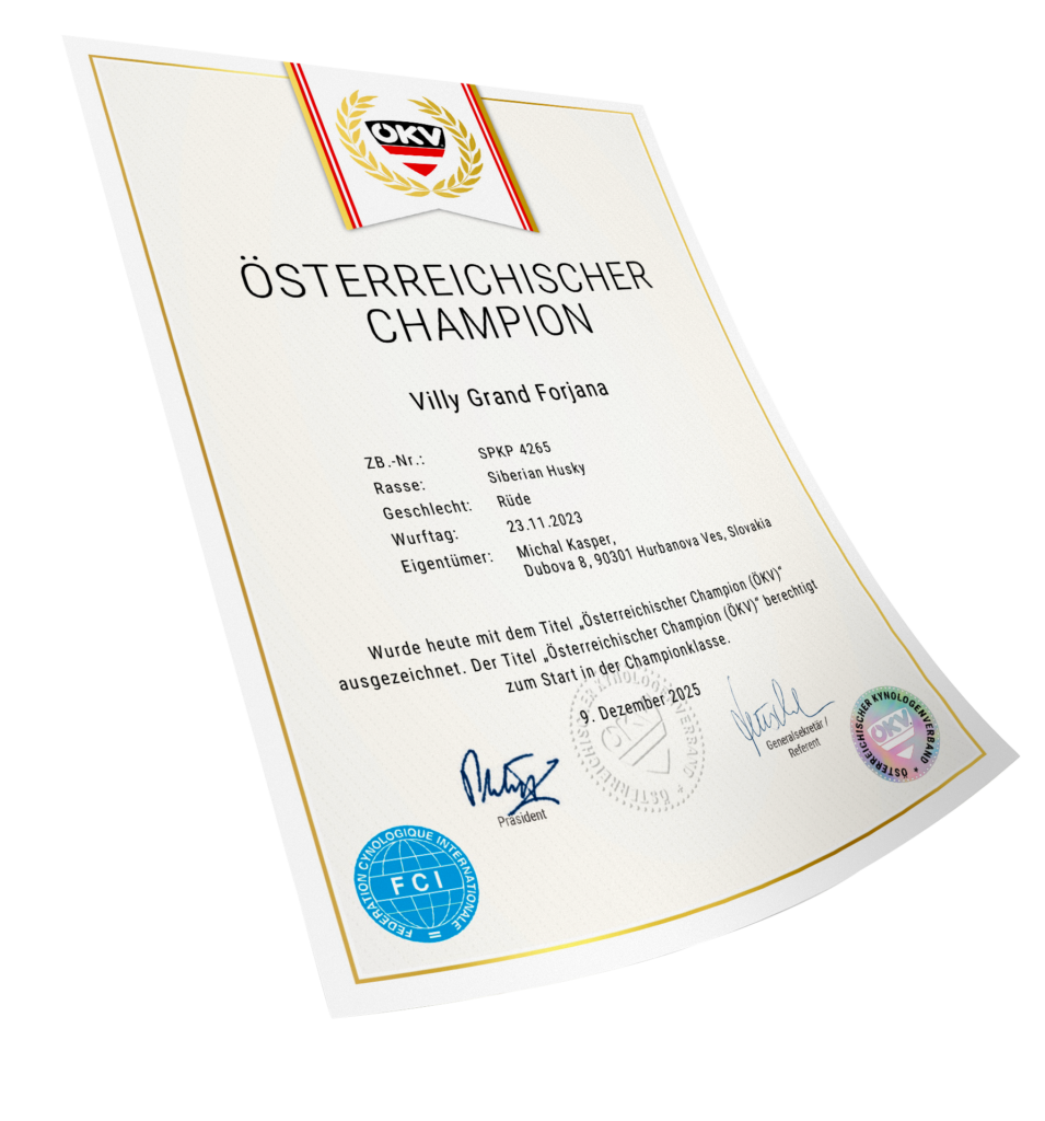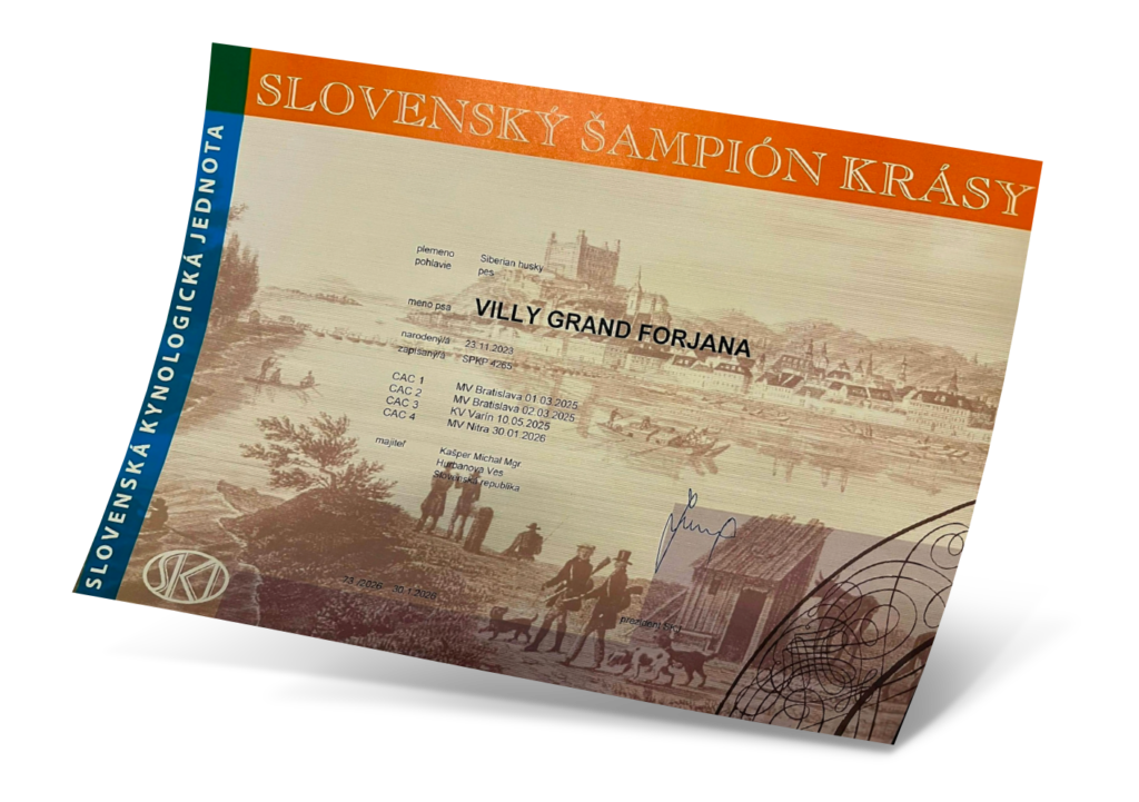 Ocenenia Nitradog 30.1.2026 Championshipshow HUND WELS 2025 Esztergom 2 x CAC 16.11.2025 Komarom CACIB 3-4.10.2025 International Championship show DU & DAS TIER TULLN 10-12.10.2025 Arad 4-6.7.2025 Winter Danube 1-2.3.2025 Danube CACIB 25-27.10.2024 NitraDog CACIB 19.12.2024 Šampionáty
