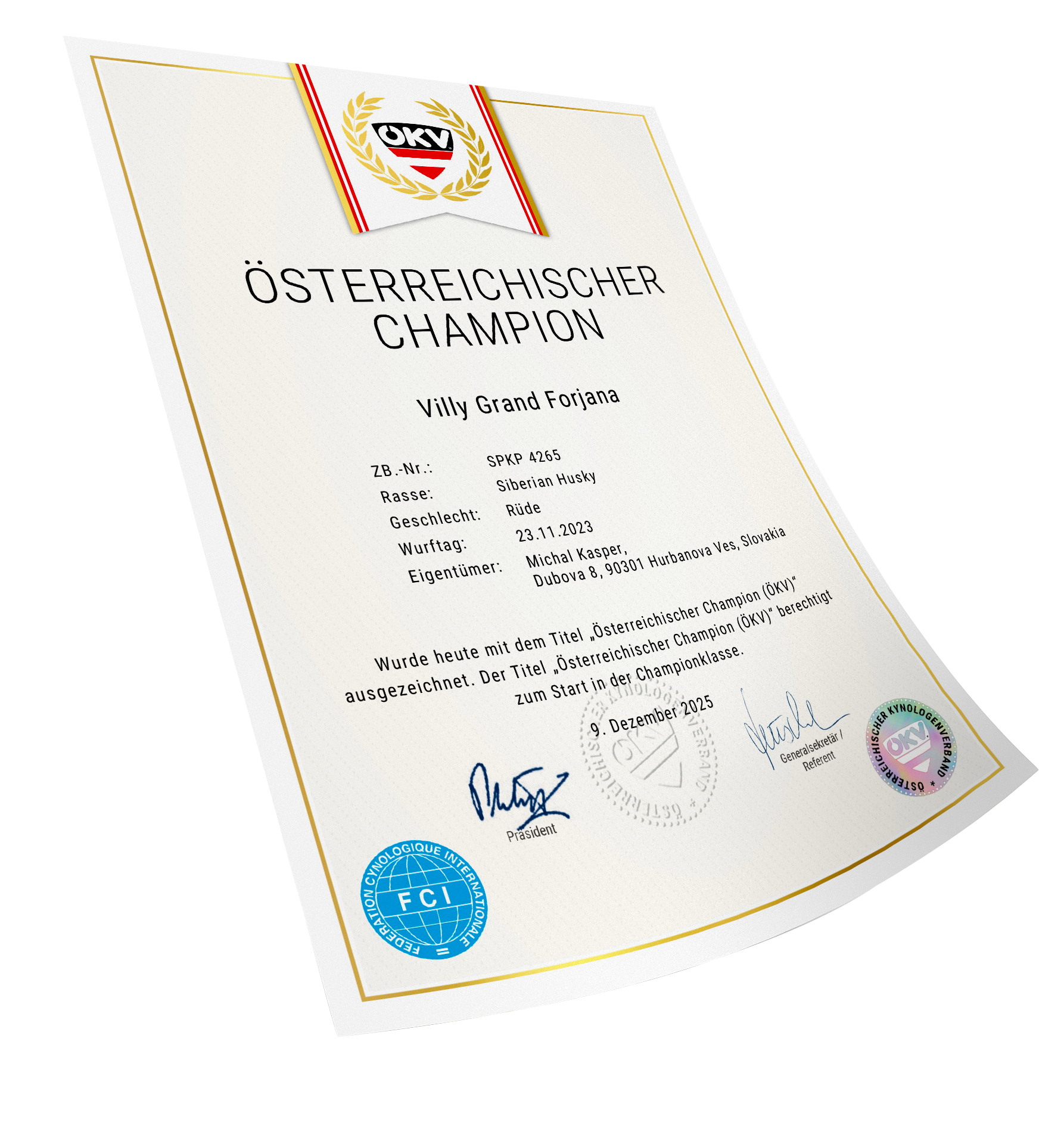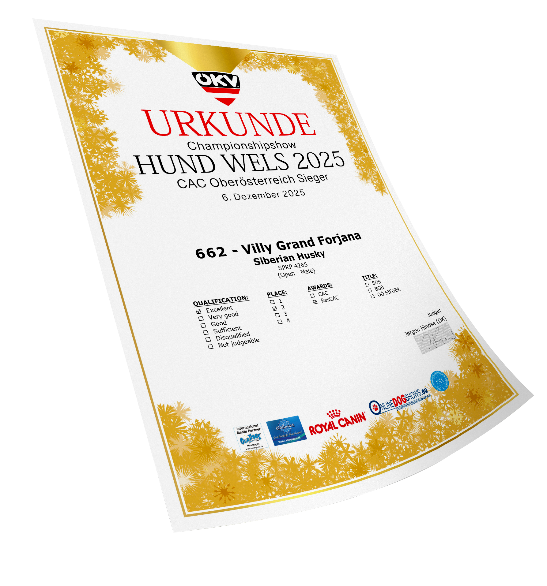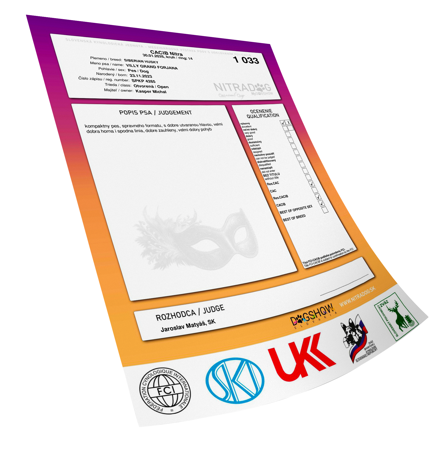 Ocenenia Nitradog 30.1.2026 Championshipshow HUND WELS 2025 Esztergom 2 x CAC 16.11.2025 Komarom CACIB 3-4.10.2025 International Championship show DU & DAS TIER TULLN 10-12.10.2025 Arad 4-6.7.2025 Winter Danube 1-2.3.2025 Danube CACIB 25-27.10.2024 NitraDog CACIB 19.12.2024 Šampionáty